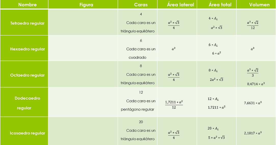 Tabla de relación de áreas y volúmenes de Poliedros Regulares