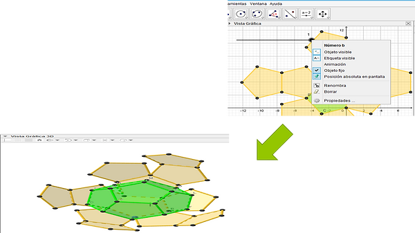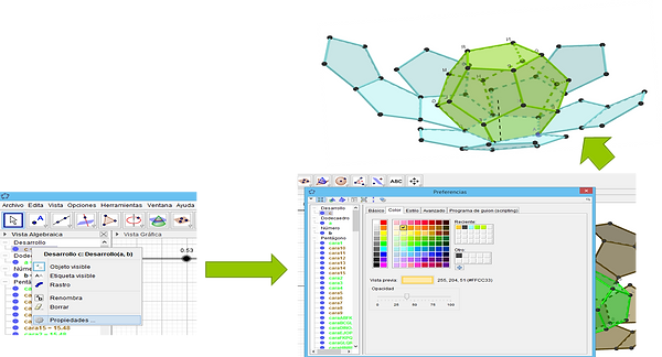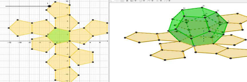Si deseas ver cómo se encuentra constituido el poliedro en la barra de herramientas en el menú desplegable indicas desarrollo y aplicas sobre el grafico en 3D y podrás apreciar como aparecen las caras del poliedro tanto en la vista gráfica como en vista gráfica 3D y usar estas caras para realizar estos sólidos físicamente