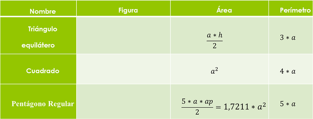 Áreas y perímetros de los polígonos regulares usados en los poliedros regulares